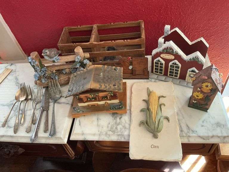 Assortment of home decor. Music box, napkin holder, old silverware, bluebird decor.