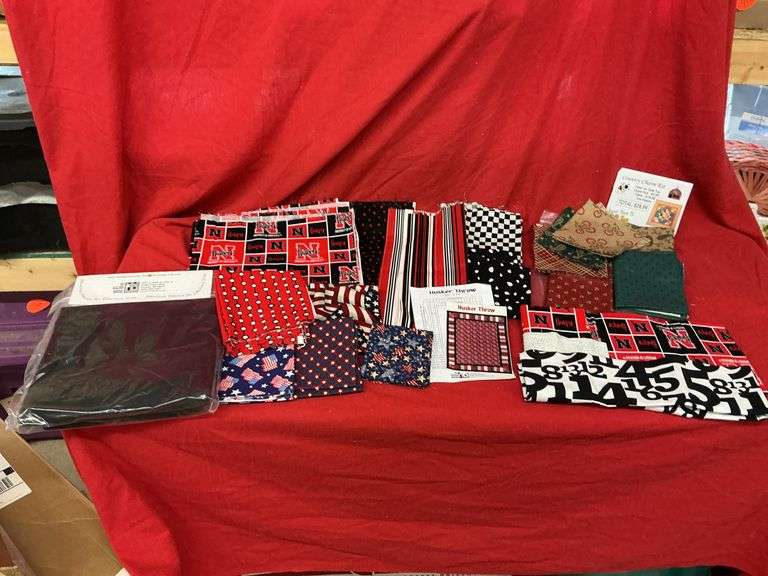 patriotic fabric,Husker material, numbered material, fabric for quilt tops, and a big piece of black fabric and other black and white and red pieces