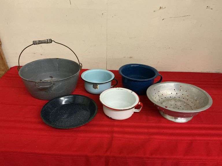 enamelware pots, kettle, plate, and an aluminum colander