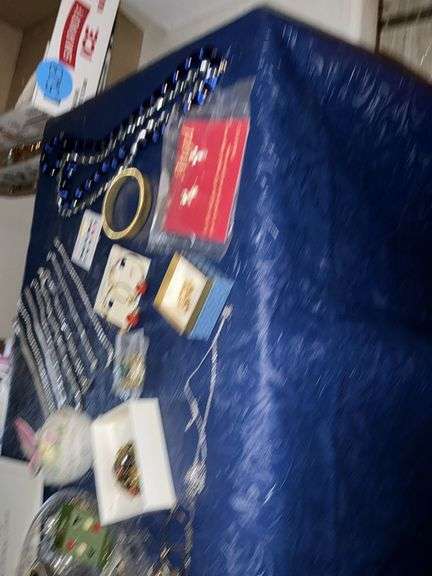 Earrings, brooches, necklaces, bracelets, mothers ring, jewelry, polishing cloth, and small jewelry box