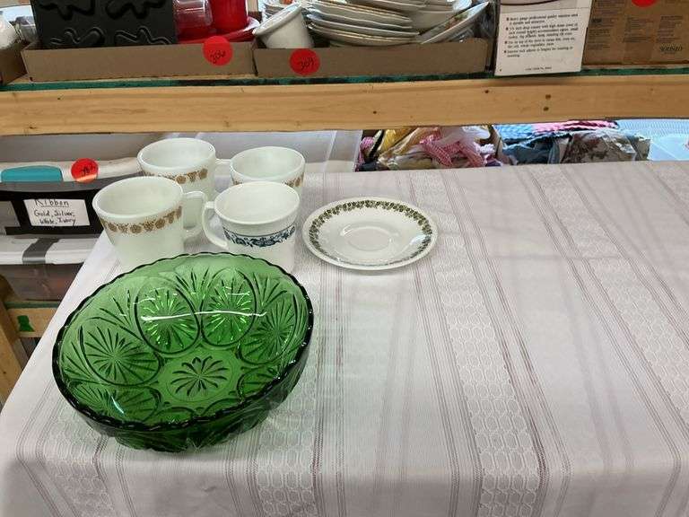 Four corral cups, one plate and green glass bowl