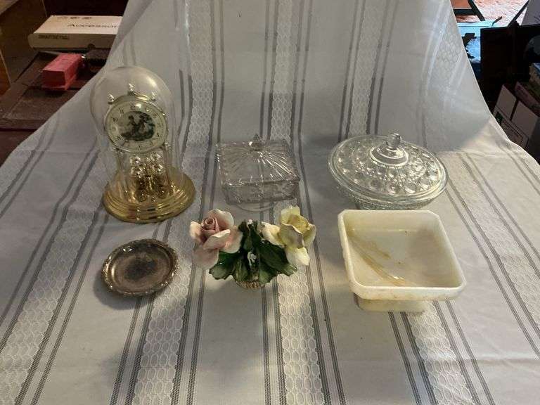 domed mantle clock- ceramic floral decoration- glassware- milk glass vase- little brass tray