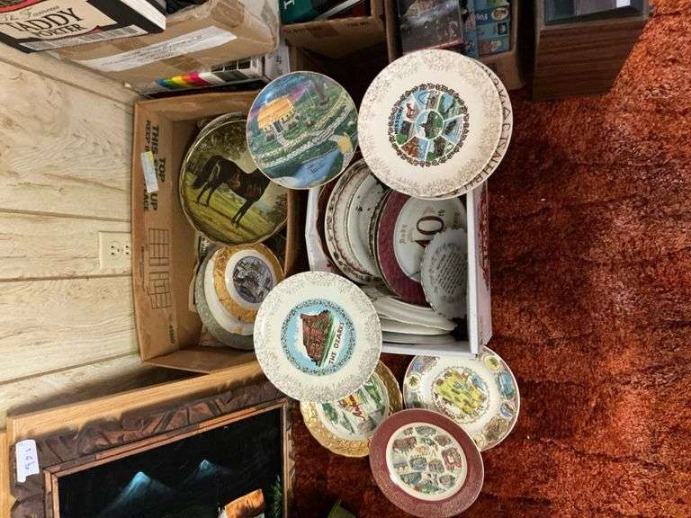 Two boxes of collectible plates, including state plates, anniversary plates, and more