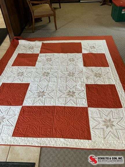 LOT 150 - rust colored cross stitched star quilt (7’3” X 8’1”)