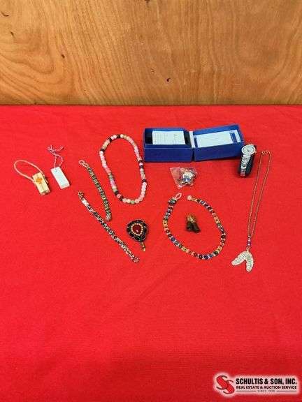 LOT 170 - Messenger from heaven ladies watch- Herbie the Husker pin- Three colorful bracelets- necklace with t