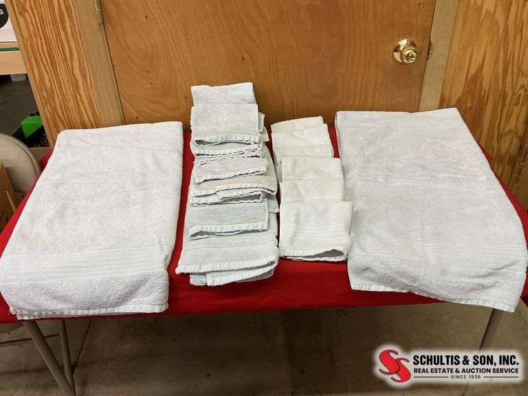 LOT 204 - two nice light gray bath towels- 7 light gray hand towels- 6 washcloths