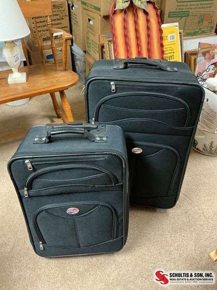 Two-piece black soft-shell luggage set with telescoping handles and rolling wheels. Features zip compartments and fabric exteriors.