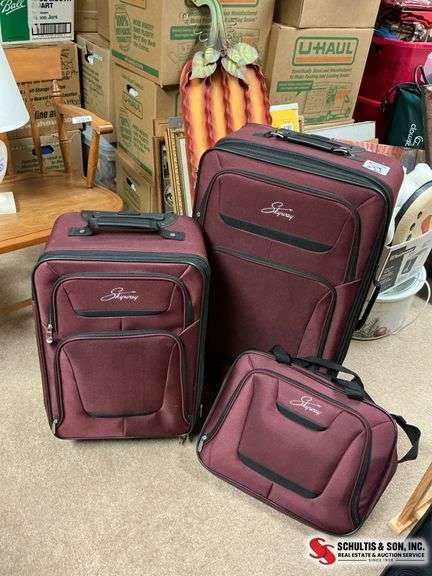 Three Skyway burgundy rolling suitcases with zippered compartments and fabric lining. Includes a large suitcase, medium upright suitcase, and carry-on bag. Used condition with light wear.