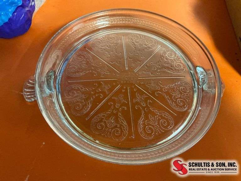 Fireking Clear glass pie dish with embossed decorative pattern on base and scalloped handles. Measures approximately 9 inches in diameter. Suitable for baking or serving.