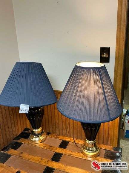 Table lamps with black ceramic bases and brass-tone accents. Includes pleated blue fabric shades. Light wear consistent with use.