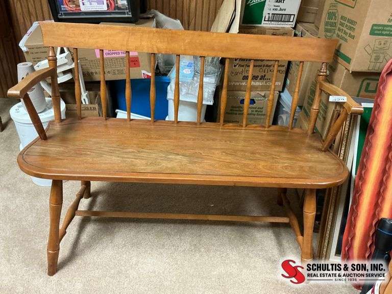 Antique wooden bench with spindle backrest and curved arms. Crafted with turned legs and stretcher support, showcasing natural wood grain. Minor wear consistent with age.
