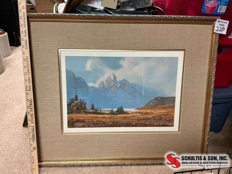 Print of a mountain landscape with lake and field, in a gold-tone frame with beige matting. Noted as signed on the artwork and back dated 1995. Frame measures approximately 31 x 27 inches. Condition appears consistent with age.
