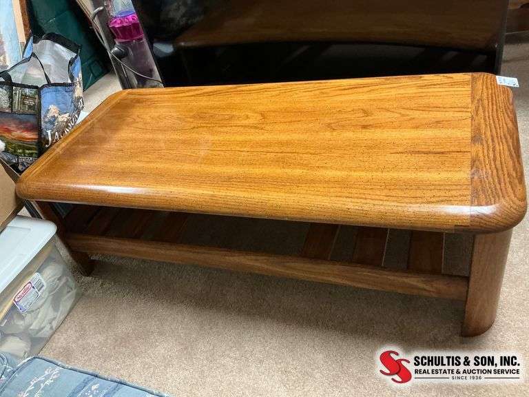 Rectangular oak coffee table featuring rounded edges and a slatted lower shelf. Shows wear consistent with age and use.