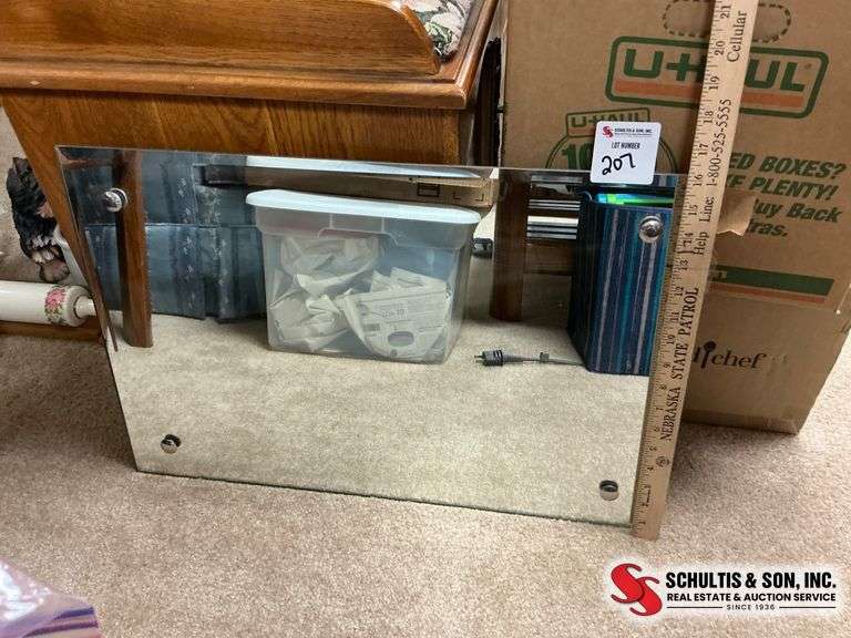 Rectangular mirror with four decorative mounting caps. Backed with plywood and equipped with hanging hardware. Measures approximately 24 inches in width.
