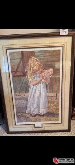 Framed print depicting a blonde-haired child in a long dress holding a doll. The artwork is matted with decorative accents and housed in a wood-patterned frame under glass. Approximate dimensions can be provided upon request.