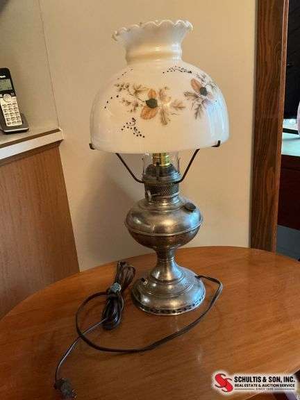 Antique metal oil lamp with floral-painted glass shade featuring ruffled edges. Converted to electric with visible cord. Moderate wear consistent with age.