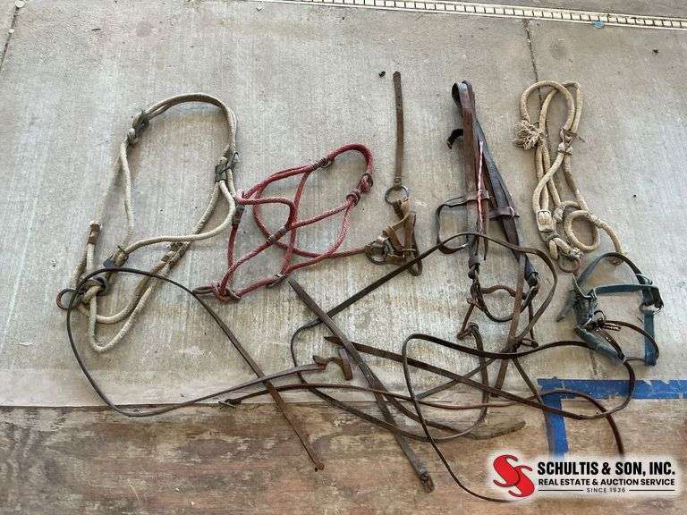 Leather and rope horse tack, such as bridles, halters, and lead ropes. Shows wear from use. Condition details available upon request.