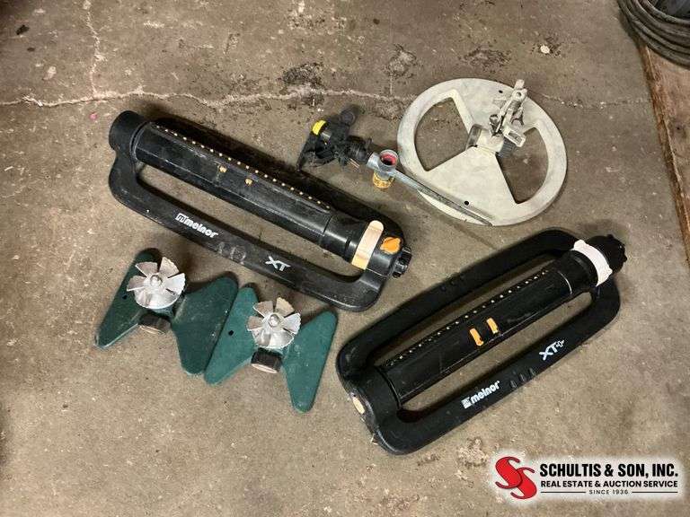 Lawn sprinkler components including two oscillating sprinklers and other sprinkler attachments. Items show signs of prior use.