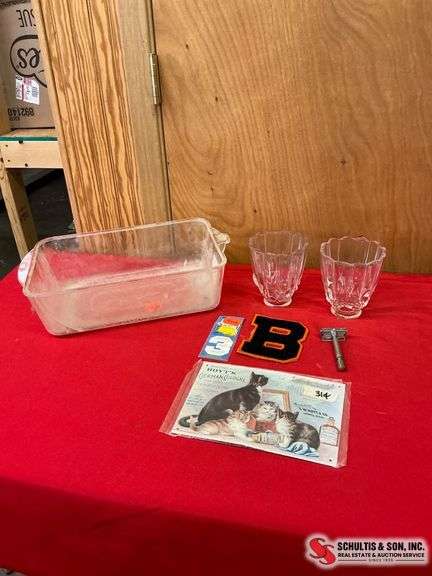 Includes a rectangular glass baking dish, two crystal-style glasses, a fabric patch, a shaving razor, and a vintage-style cat-themed print.