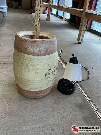 Large ceramic planter with two-tone design and decorative cutouts. Black desk lamp with flexible neck and white shade. Planter shows wear and marks; lamp is functional with some surface wear.