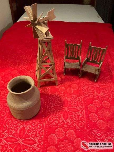 A handcrafted clay vase, a wooden windmill model, and two miniature wooden rocking chairs. Vase has a stamped base. Minor wear evident.