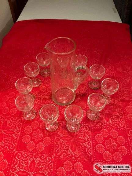 Clear glass set including one etched pitcher with handle and spout, accompanied by ten matching etched stemmed glasses. Designs feature elegant etched botanical motifs. Glassware dimensions available upon request. Minor use wear visible.