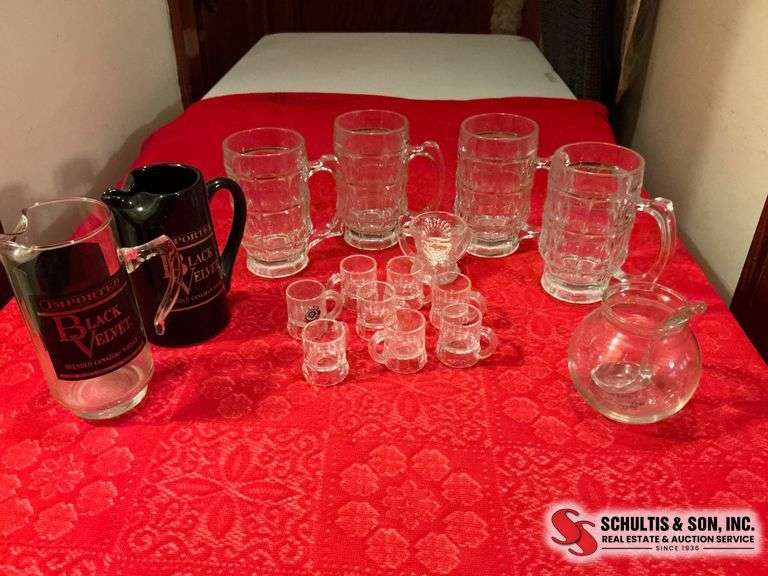 Includes Black Velvet pitchers, large glass mugs, mini glass steins, crystal sugar bowl with spoon, and other bar items. Visible wear consistent with prior use.