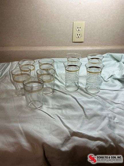 Nine clear glass tumblers featuring gold band accents. Includes five straight-sided glasses and four ribbed, flared rim glasses. Light wear visible on gold bands.