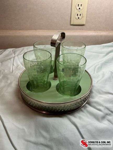 Four light green etched glass tumblers with a metal holder featuring a central handle and cutout slots. Tumblers show floral or grape-like etchings, and the holder has an ornate design. Minor wear is visible on the metal frame. Dimensions available upon request.