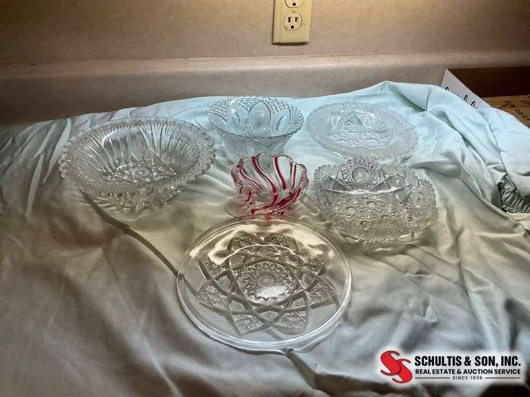 Seven clear and colored glass bowls with intricate patterns and designs. Includes one swirl pink and clear bowl. Varying sizes and styles. Minor wear visible.