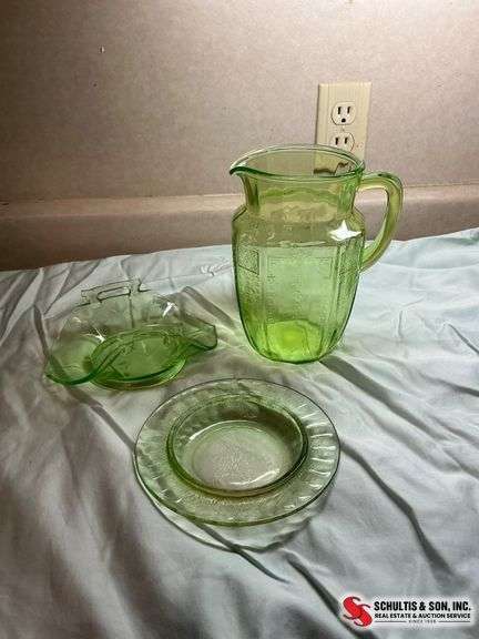 Three-piece green Depression glass set including a pitcher, handled bowl, and round plate. Embossed geometric details. Light wear consistent with age.