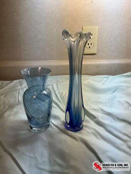 Includes a shorter flared vase with a swirl pattern and a taller ruffled vase with cobalt blue accents. Both appear hand-blown and show minor surface wear.