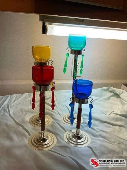 Four candleholders featuring colored glass cups in red, blue, green, and yellow. Accented with matching glass prisms, mounted on wooden stems and metal bases. Includes two taller and two shorter holders.
