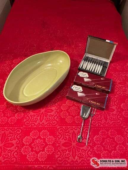 Includes a ceramic oval dish, a box of 12 stainless steel mini forks, and two fork-and-shovel snack server sets.