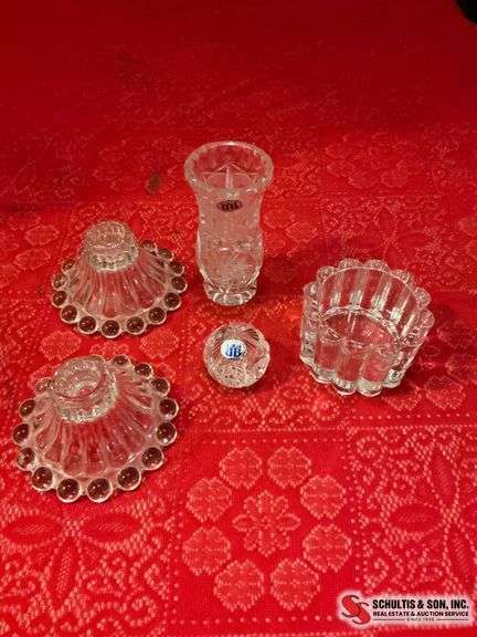 Pressed glass items, including a vase, two candle holders, a scalloped bowl, and a faceted orb. Featuring etched and embossed details. No chips or cracks.