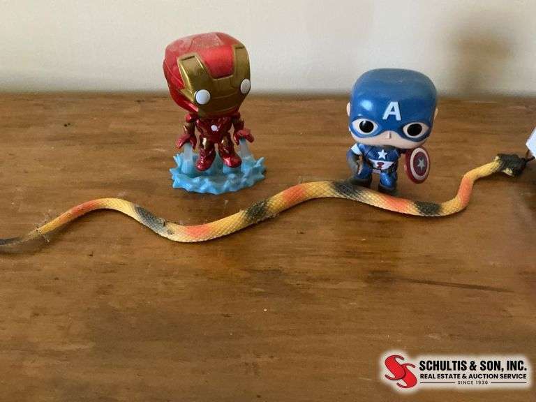 Two pop-style collectible figures, Captain America and Iron Man, alongside a plastic toy snake. Figures depict superhero characters in detailed costumes. Figures approximately 4 inches tall.