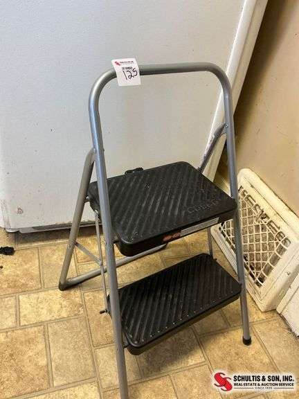 Metal two-step folding ladder with black plastic steps featuring slip-resistant surfaces. Lightweight and compact for storage.