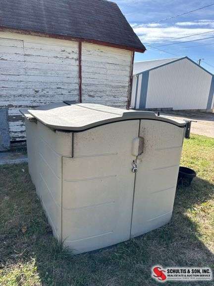 Rubbermaid Slide-Lid Storage Shed, Model 3752. Made of durable resin plastic with double doors and a locking mechanism. Includes lid that slides open for easy access. Assembly instructions shown. Wear consistent with outdoor use.