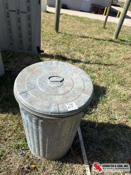 A round metal trash can with a fitted lid and side handles. Features ribbed details on its body. Shows signs of wear and outdoor exposure.