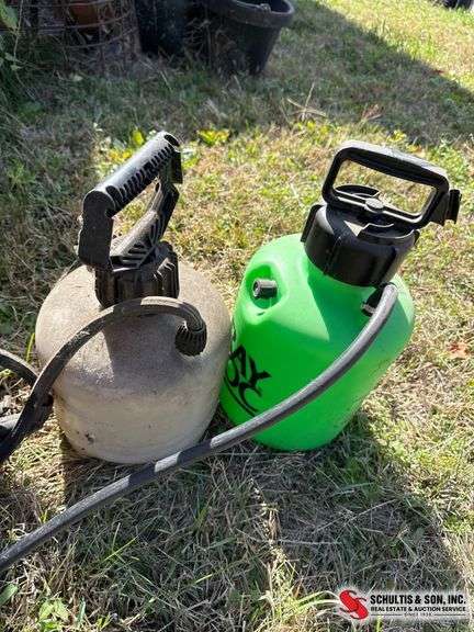 Two hand-pump sprayers with plastic reservoirs and hose attachments, one green and one white, for liquid dispersion.