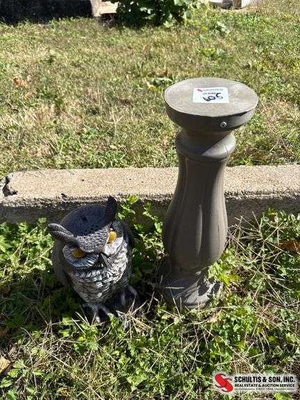 Includes a molded owl figurine with textured details and painted yellow eyes and a painted pedestal with a grooved design. Outdoor wear evident.