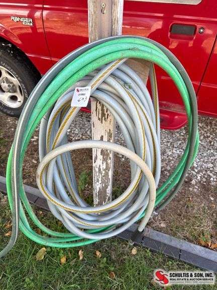 Garden hoses in various colors, coiled and mounted on a post. Some wear is visible from outdoor use.