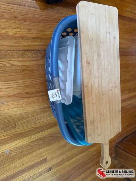 Blue plastic bin holding a wooden cutting board and plastic kitchen containers with lids.