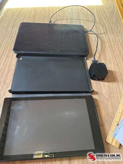 Two Amazon Kindle tablets, one protective case, and a charging adapter. Visible wear present on devices. Functionality untested.