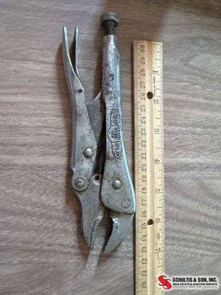 Petersen Mfg Dewitt NE Vise-Grip brand locking pliers with adjustable screw knob and clamp mechanism. Approx. 7 inches long.