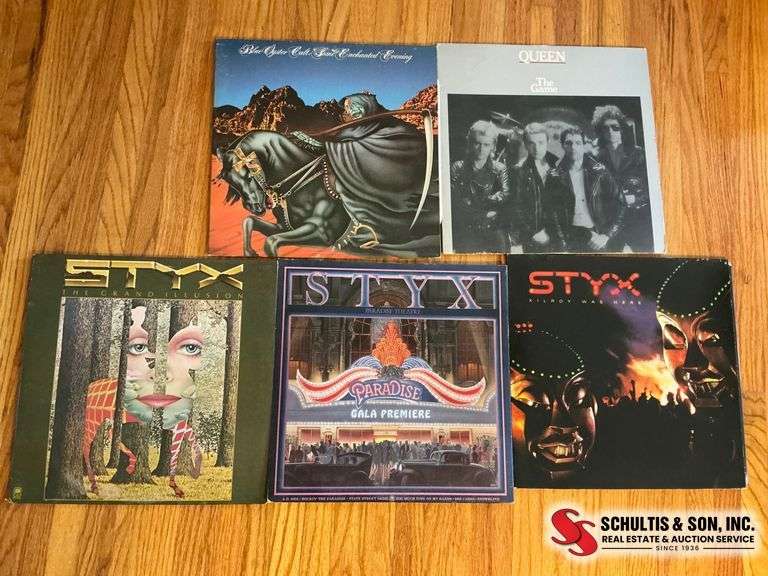 5 vinyl records featuring albums by Queen and Styx and Blue Oyster Cult . Records show typical wear, with visible album artwork and track lists.