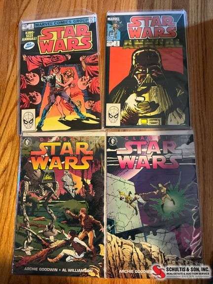 Four Star Wars comic books: 'King-Size Annual,' 'Star Wars #68,' and two 1980s reprints by Archie Goodwin and Al Williamson. Covers feature iconic Star Wars imagery and characters. All encased in protective sleeves, light wear visible on edges. Individual issue release dates range across the late 1970s to 1980s.