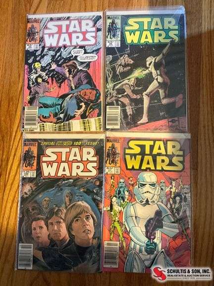 Four Star Wars comic books from Marvel, featuring issues with iconic cover art. Bagged and boarded for preservation. May show wear consistent with handling.