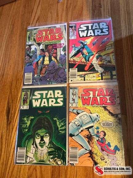 Four Marvel Star Wars comic books, issues featuring various cover art. Stored in plastic sleeves. Condition varies.