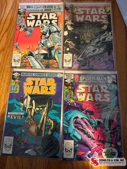 Four Marvel Comics 'Star Wars' issues, each in plastic sleeves featuring colorful covers. Includes notable storylines like 'Resurrection of Evil!' with visible pricing and branding details. Condition appears consistent with preservation in protective sleeves.